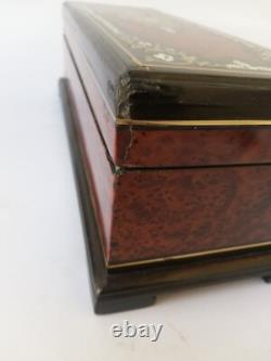 Lock, fittings, and hinges are made of brass. Black-stained pear veneer on the edges. H 10.3 cm x W 31 cm x D 12 cm. In generally good condition, with a bump on the lid, one corner slightly damaged, and a loss of thuya veneer at the hinge (see last 3 photos). The key is missing; the lock has been tested and is functional, with fittings in order.