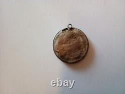 Miniature pendant in silver and rhinestones from the 19th century. Beautiful silver and rhinestone pendant featuring a hand-painted miniature depicting an angel or cherub with a bow shooting an arrow (Cupid), representative of the era. Often found as a brooch, much rarer as a pendant. Diameter of the miniature: 3 cm. Diameter of the pendant: 4.3 cm. Vintage jewelry in excellent condition.