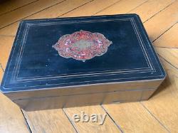 Black lacquered wooden box, signed TAHAN, with brass inlays, from the 19th century, Napoleon III era. Marquetry on the top of the box. Signature TAHAN, PARIS, rue de la Paix (on the brass of the lock). The front of the box can tilt. The box is in good condition, with signs of wear. No significant accidents or missing parts.
