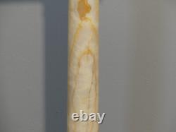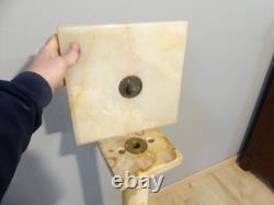 Colonne sellette à plateau tournant en onyx veiné et bronze doré. Sur une base carrée, le fût en onyx cylindrique s'élance. Il est cerclé haut et bas par de très beaux bronzes dorés et ciselés. Le plateau d'exposition tourne sur son axe permettant d'admirer l'oeuvre s'y trouvant sous toute ses faces. Dorure éclatante mais passée par endroits. Epoque fin XIX ème siècle. Objet très lourd (50 kg), livraison à plat sur une palette par transporteur, 150 euros en France, 300 euros en UE et 1000 euros reste du monde. Largeur: base 34 cm, plateau 30 cm Hauteur: 111.5 cm.