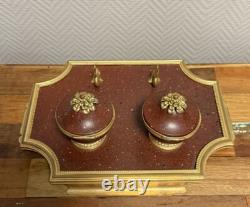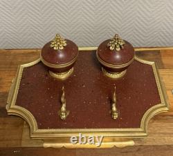Encrier au dauphins Empire en bronze doré et marbre griotte époque XIXeme. 2 pots couverts (1 reservoir intérieur en verre manquant). Contour de forme mouvementée ceinturé d'un joli bronze doré. H12 x 33 x 26 cm. Paiement en 2 fois possible (téléphoner au préalable).
